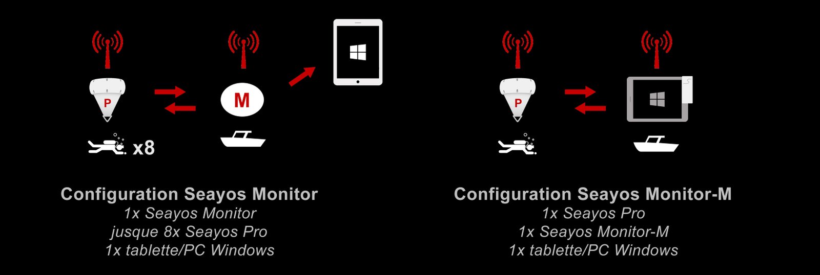Les SEAYOS Monitor et SEAYOS Monitor-M se distinguent du reste de la gamme SEAYOS car, contrairement à nos produits, ils ne peuvent être utilisés en immersion et indépendamment de un (ou plusieurs pour le Monitor-M) SEAYOS Pro.
